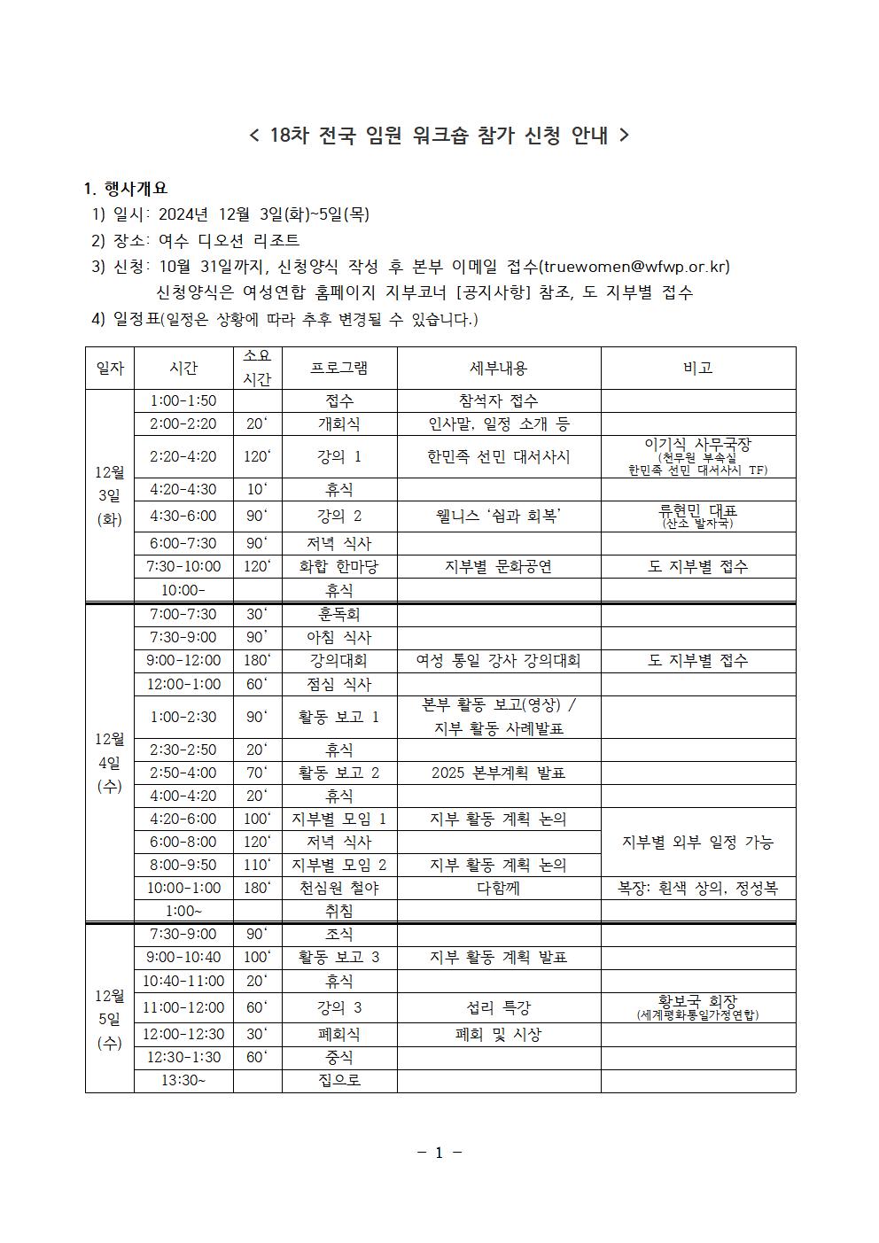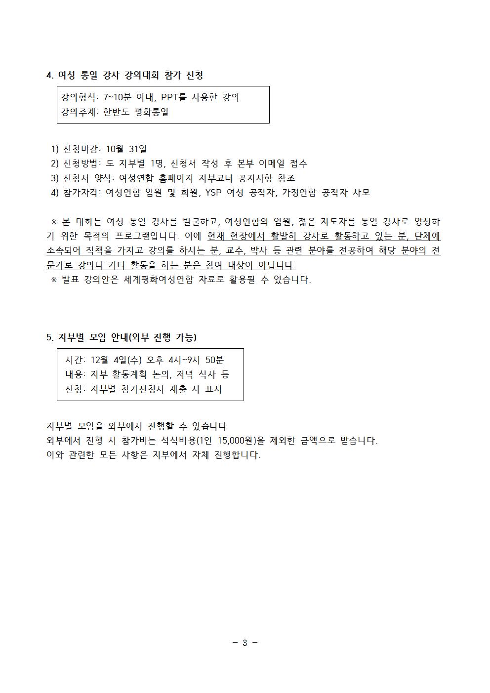 9:00-12:00 | 180‘ | 강의대회 | 여성 통일 강사 강의대회 | 도 지부별 접수 | |
