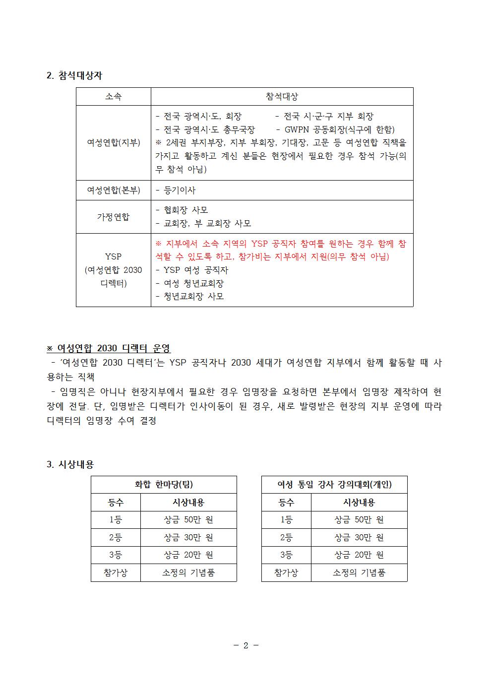 YSP (여성연합 2030 디렉터) | ※ 지부에서 소속 지역의 YSP 공직자 참여를 원하는 경우 함께 참석할 수 있도록 하고, 참가비는 지부에서 지원(의무 참석 아님) - YSP 여성 공직자 여성 청년교회장 청년교회장 사모 |